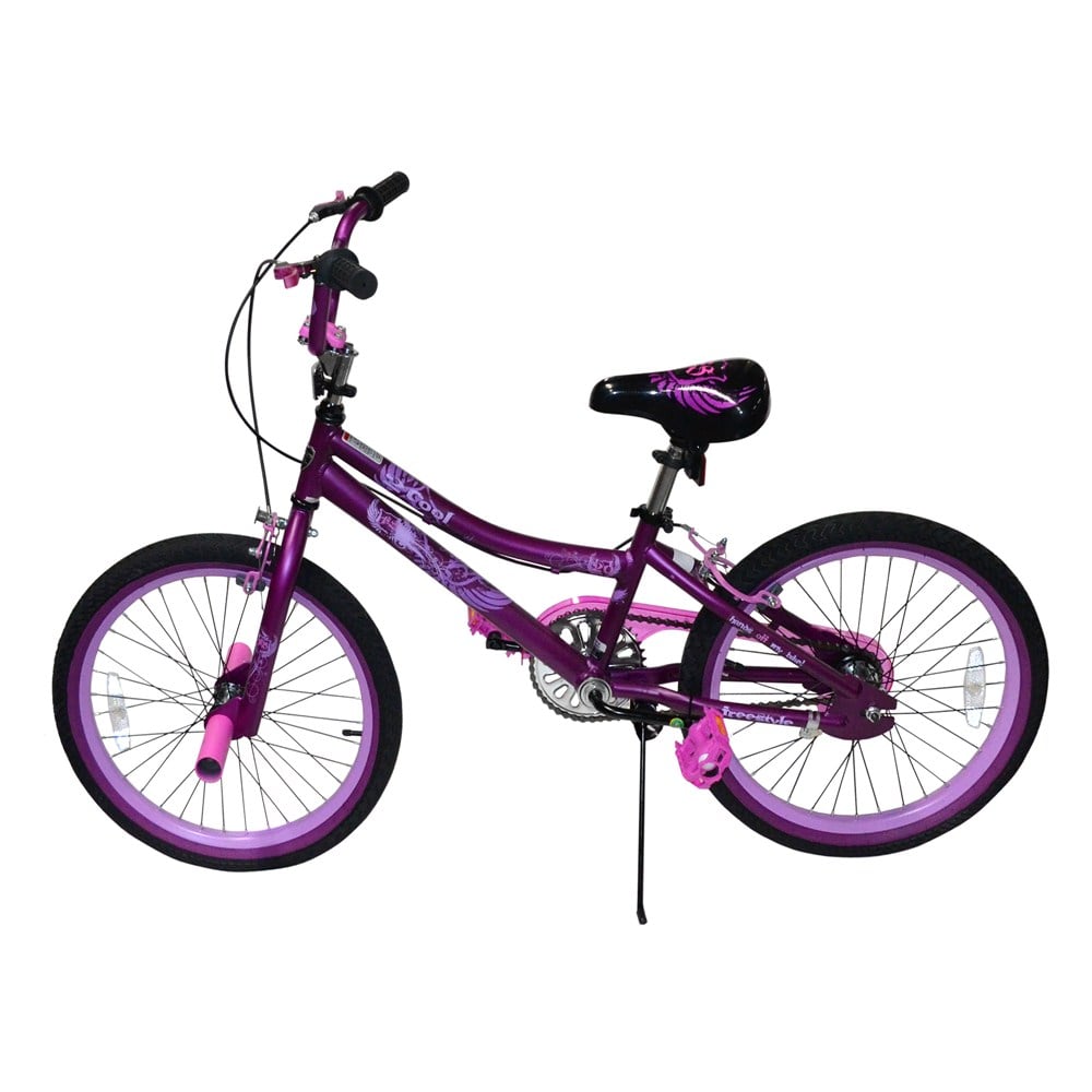 20" Kent 2 Cool Girls' BMX Bike, Satin Purple: Frame: durable steel frame with a drop bar Gearing (# of speeds): single speed Brakes: rear foot brake plus dual hand brakes round out this 20" girls' bike Wheels/tires: 20" tires Handlebars: steel BMX handlebars Seat: colorful padded seat Pedals: plastic pedals Assembly: adult assembly required.