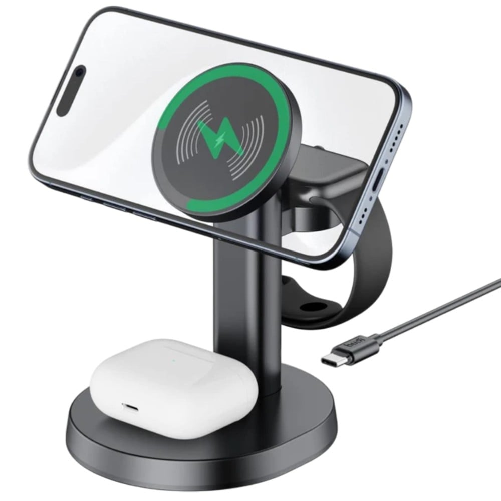 Mobile phone holder and charger 3 in 1. This unique and highly functional product manages to support and charge your most important devices such as mobile phone, smart watch and wifi headphones. With a power of 20 W, this multifunctional device manages to distribute its power by charging your mobile phone with a power of 15 W, your watch with 2.5 W and your headphones with 2.5 W. The magnetic part of this product will secure your devices during charging, but not only, as it is also a great holder for these accessories.
