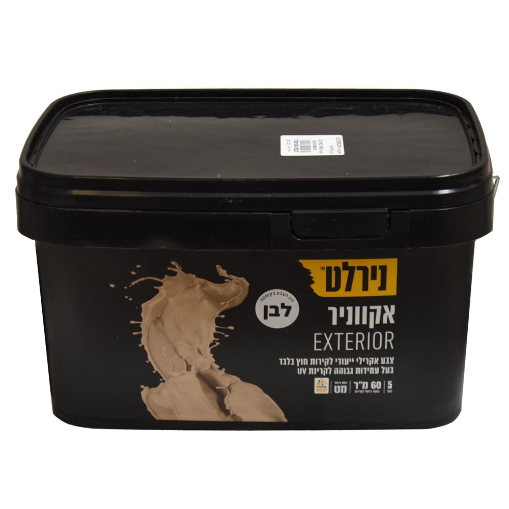 Aquanir acrylic paint, 5 Lt, Base A. Flexible acrylic paint with exceptional coverage, usable for outdoors. After painting, a soft velvet layer is obtained, which gives the wall of the house a pleasant, calm and elegant appearance .Durable over time and preserves the appearance.Nirocryl carries the Israel 1945 standard mark.Typical use: for exterior wall painting.Preparation of the surface: clean the surface well from impurities such as: lime, dust, layers of previous paint, grease, etc. , before you start painting. Make sure the previous paint is well adhered to the wall. Remove the wall chips well with a trowel and sandpaper. Cleaning: tools and hands should be cleaned with soap and water immediately after use. Characteristics of the coating of painting: shade of color: white plus 1500 shades from nirlat's nice catalog Gloss level: matte Material data: acrylic mixture based on water and mineral substances Dissolving: with u you are up to 20% for the first layer. 10% for the second layer. Coverage: 16 m2 per liter in two layers. Viscosity: 98KU ± 10%. The coverage ability is calculated according to the measurement of the work of an experienced and skilled worker, with a different degree of acquisition and may vary depending on the working method, surface and climatic conditions. Restrictions: do not apply the paint when the temperature is below 7°C or when rain is forecast. Drying time. For repainting: 2 hours (under normal weather conditions). To touch it: 1 hour. Complete drying: 24 hours.