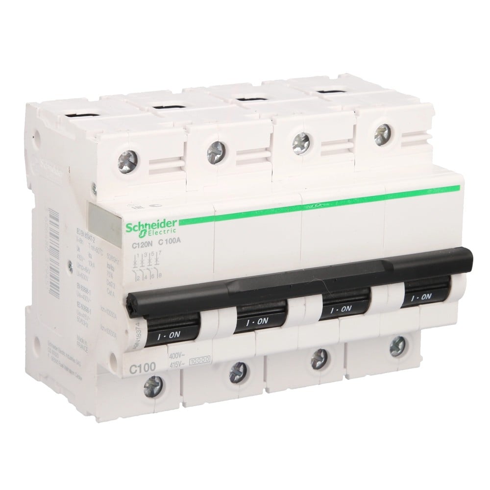 Circuit breaker, magneto-thermal circuit breaker 4P, 100A, 10kA, C120N, curve C. There are many types of single or multi-pole electrical circuit breakers, which are manufactured to protect electrical conductors from overheating. The machines are used as separators (switches) for self-contained devices or as main separators. Thus, single-phase automatic machines are widely used in our homes for washing machines, electric ovens, refrigerators, air conditioners, etc. While the other group belongs to three-phase automata that extend to industrial use.