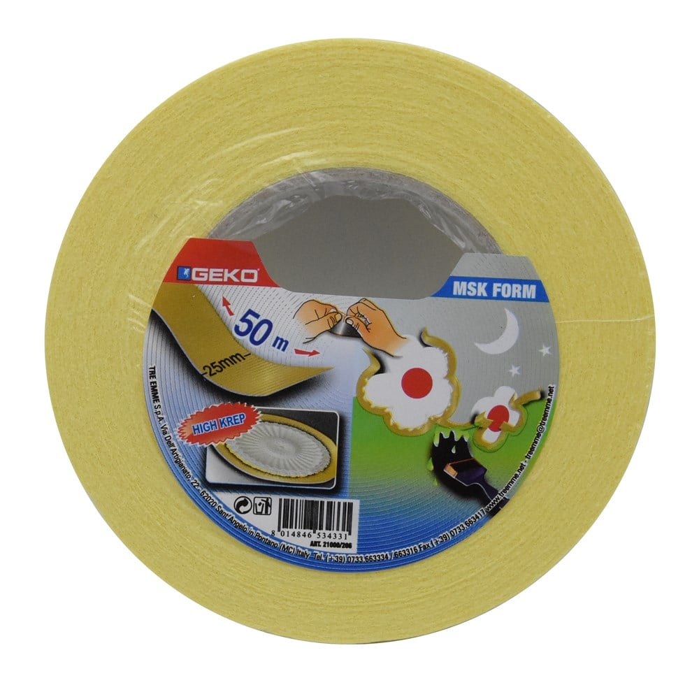 Adhesive masking tape for professional and DIY use. Solvent adhesive. Ideal also for low temperature. Sticks to many surfaces and removes cleanly with no residue. Adhesive high crepe masking tape useful for masking curvers and circles.