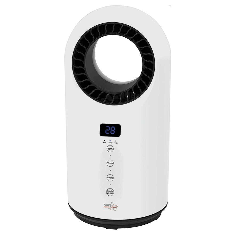 Tabletop bladeless ceramic fan heater with touch controls. LED displays. Silent Functions: Ventilation and 2 heating speeds (1000/1500W) via touch controls or with the convenient remote control Oscillation Thermostat Timer 12H Power supply: 220/240V 50Hz Power: 1500 W Colour: White/black.