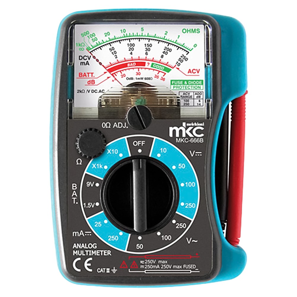 MKC pocket-sized analog multimeter, practical to take anywhere and equipped with a rubber shell to protect the instrument from impacts. battery test function, test leads integrated in the rubber case, selector for zero adjustment/control, measurement range protection. cat ii (iec 61010). Main features Analog display AC voltage (Max) 250V DC voltage (Max) 250V DC current (Max) 250mA Capacity NO Continuity test - Buzzer NO Trms Autorange