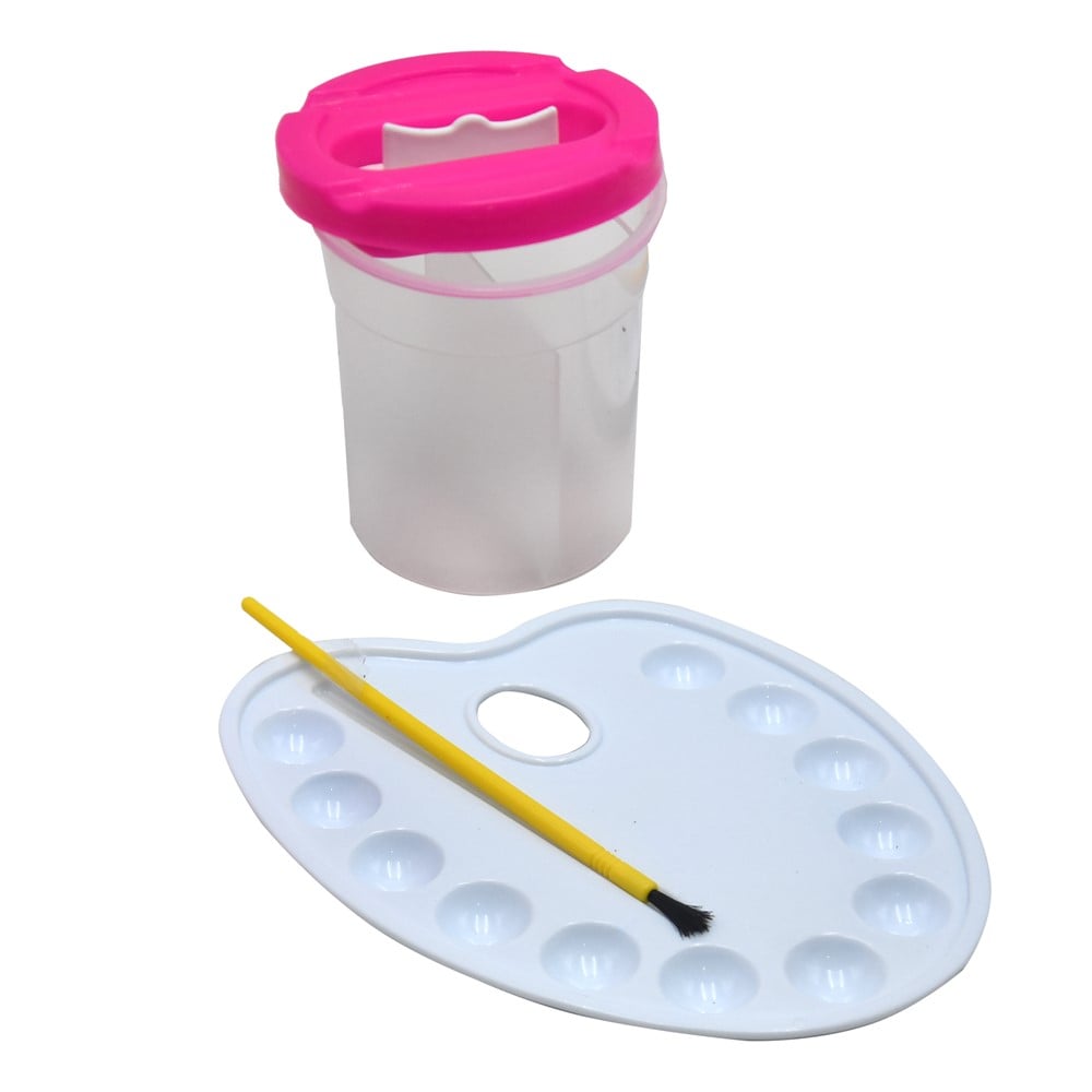Painting set which includes the glass to hold the colors, the palette for mixing colors and the brush to paint
