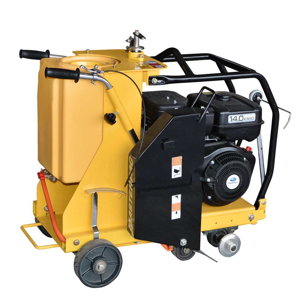 Dual blade flanges & reversible guard enable right and left hand cutting. Rugged adjustable pointer wheel assembly, adaptable for left and right hand cutting,is durable and accurate. Four rubber tyred, cast iron wheels provide stability and accurate cutting. Strong protected frame for easy transportation and protect engine undamaged. Super-rigid box frame ensures straight cuts while resisting warping and vibration--prolongs saw life; extends blade life. Quality shaft bearings for long service life. Comfortable grip handles. Easy crank for raising/lowering cutting depth. Hinged front, lift-up blade guard is designed to provide easy blade replacement. Saw position guide helps ensure straight cuts. Water system provides an optimum flow and volume of water to the blade.