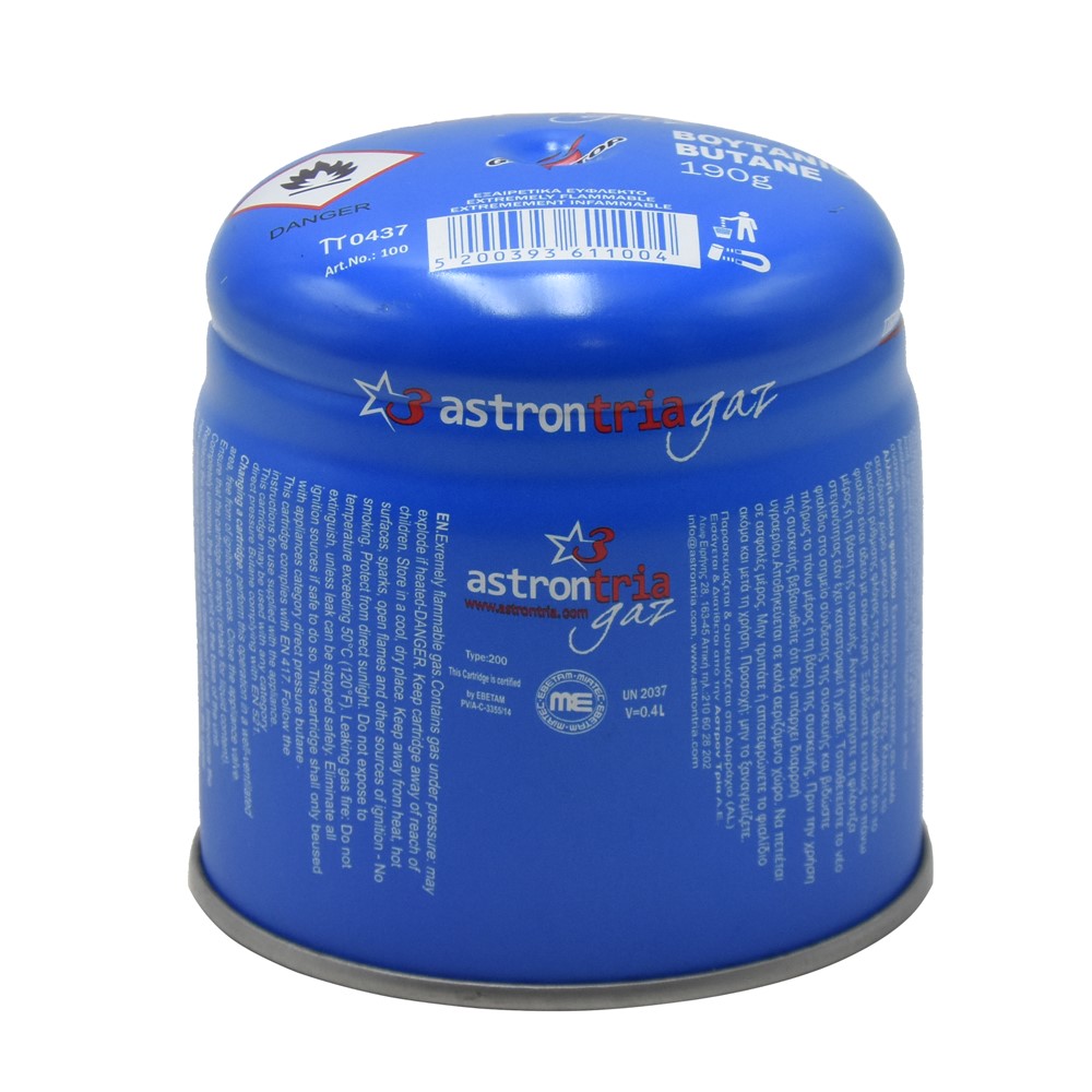 Astron gas cylinder made of butane gas, 190 gr with fuse. used in small petroleum products 190 gr. suitable for fast food, coffee oil etc.