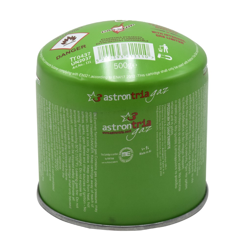 Astron tria gas bomb, made of metallic material, 500 gr, with fuse. The bulb in the upper part of it is more secure. Easy to use and suitable for use in equipment of any type of gas 500 gr.