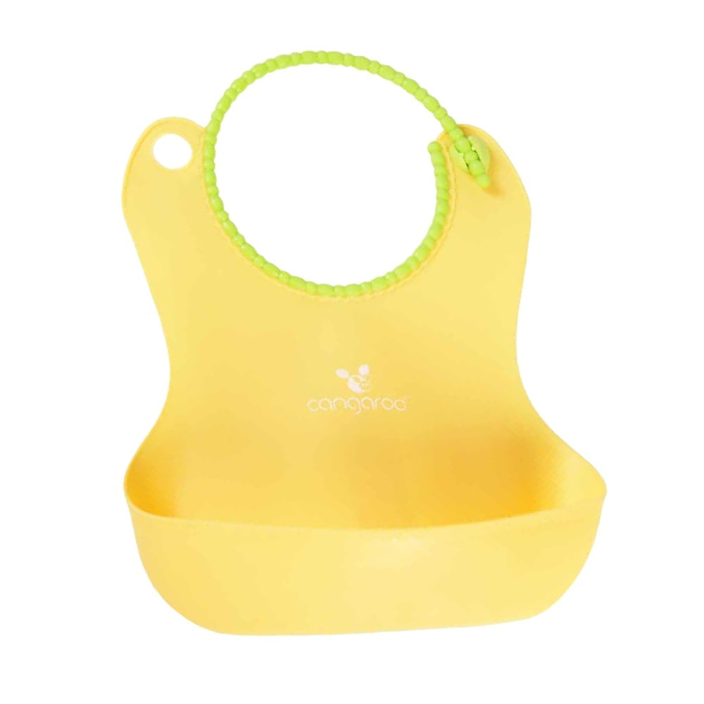 Cangaroo silicone nipple in yellow. The gill has a pocket and is made of soft silicone. Protects baby's clothes from stains. Adjustable clip.