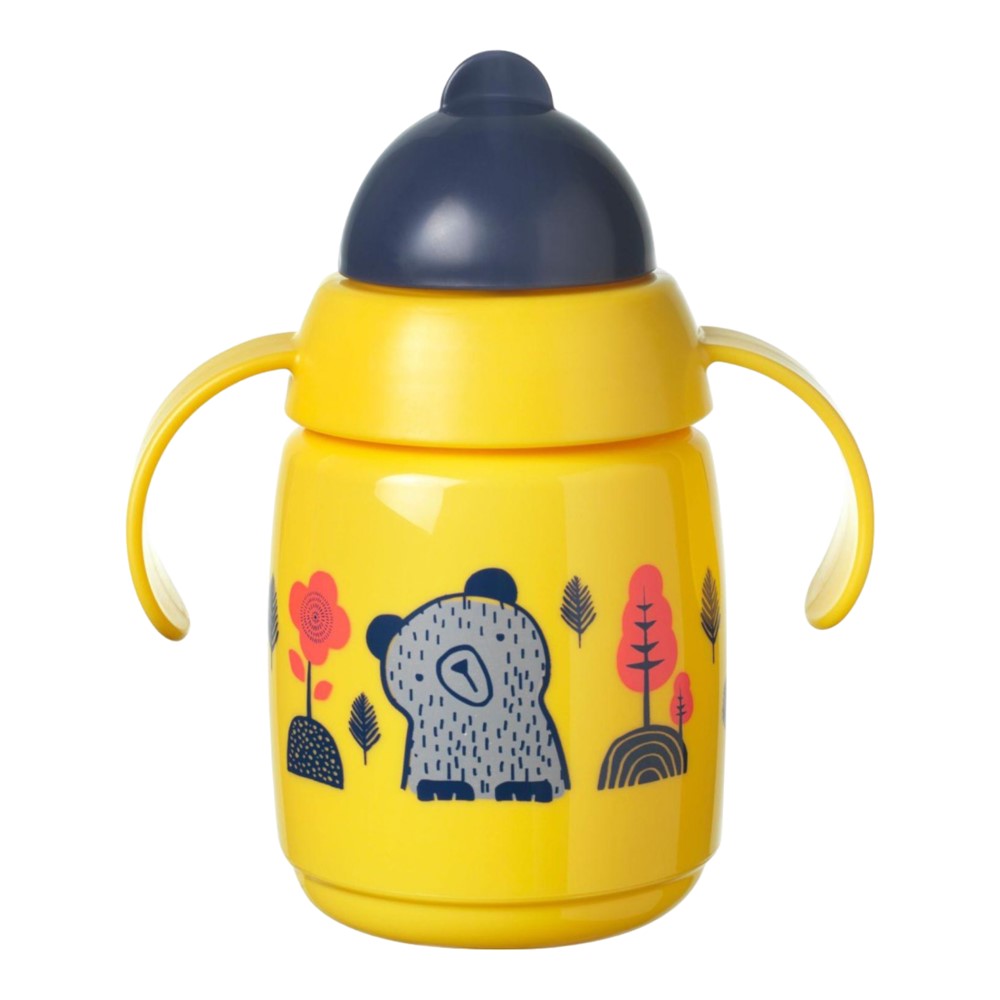Children's liquid bottle, made of thermoplastic elastomer material and polypropylene, with a feeding head made of soft silicone and a protective plastic cap, in yellow color. The bottle is equipped with handles that have an ergonomic design, which allows them to be held easy and makes them practical to use. The protective cap does not allow liquids in the bottle to spill. This product is suitable for babies over 6 months of age.