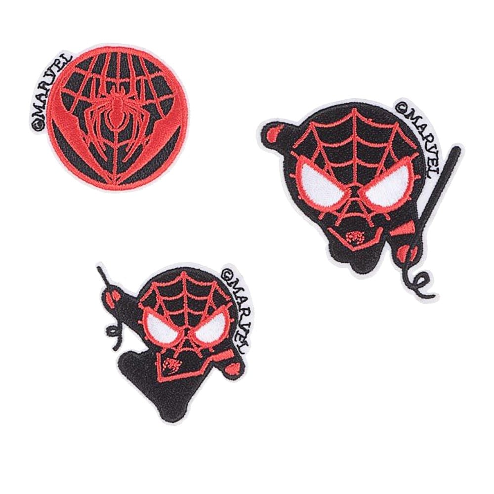 Badge pin with Spiderman print, made of polyester material, in red and black colors, which is equipped with a pin made of metallic material. The badge can be used to decorate various clothes, clothing accessories or bags. This product is suitable for use by children over 6 years old. The package contains 3 pieces.