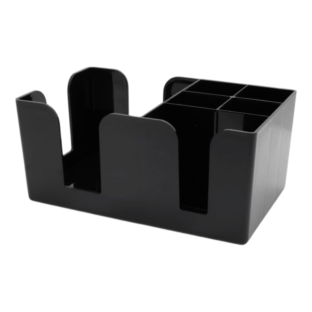 This bar organizer, made from durable black plastic, is a practical solution for keeping all the necessary drink service accessories organized and within reach at the bar. With its compact dimensions, it easily fits on any bar surface, helping to maintain a clean and organized environment.