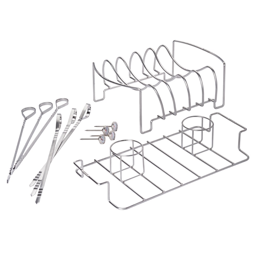 Set of barbecue accessories, made of stainless steel material with 4 parts. The set contains a rib rack, 6 stainless steel kebab skewers, a chicken roasting rack and four meat thermometers with buttons. This multifunctional set is ideal and very practical for barbecues.