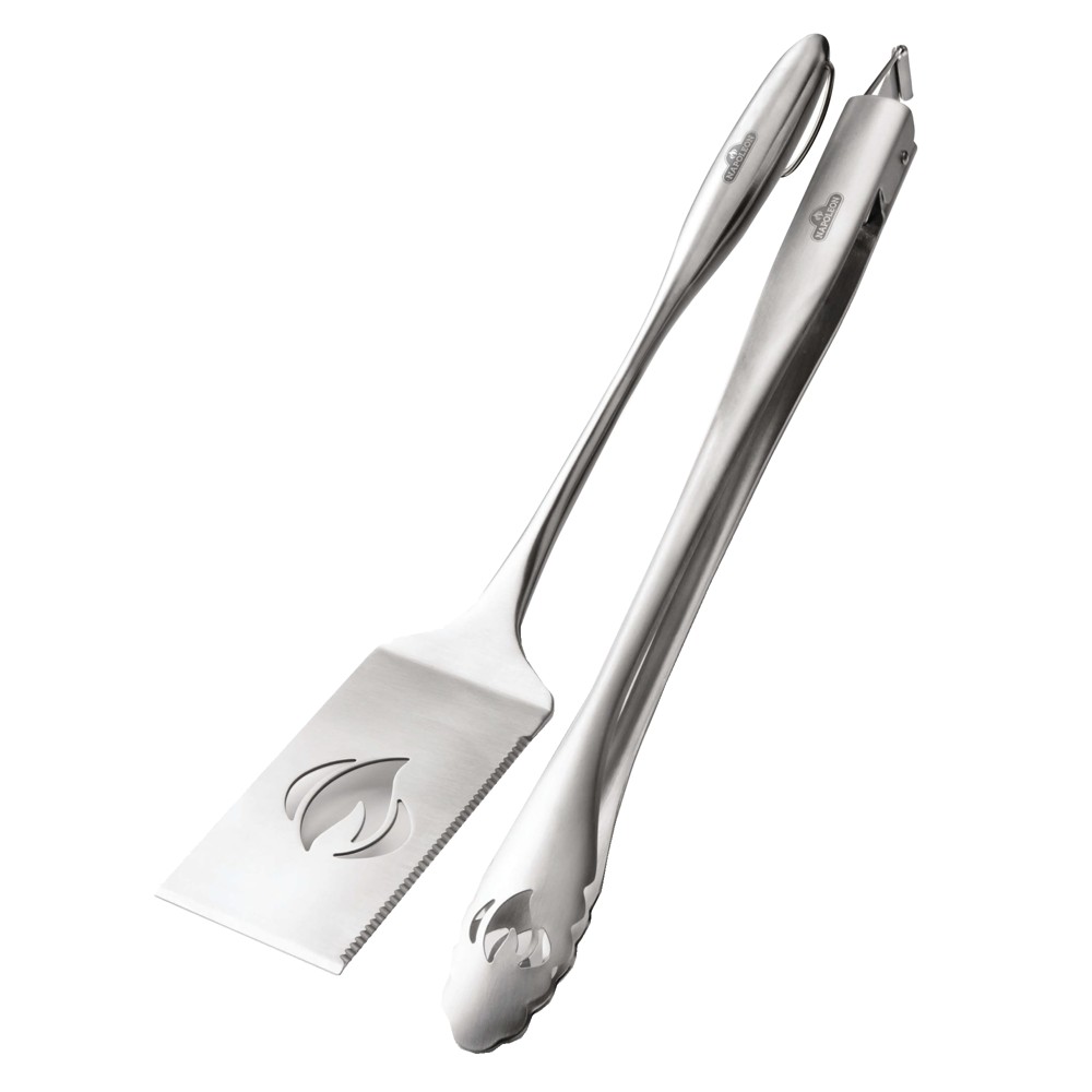 The set of stainless steel barbecue accessories is very practical and functional. The spatula has a long handle and a sharp serrated edge at the end for grabbing or cutting food, while the tongs are multi-functional and quite practical. Their handles are ergonomic and easy to hold which at the end have a hanger which helps to keep them close to the cooking area.