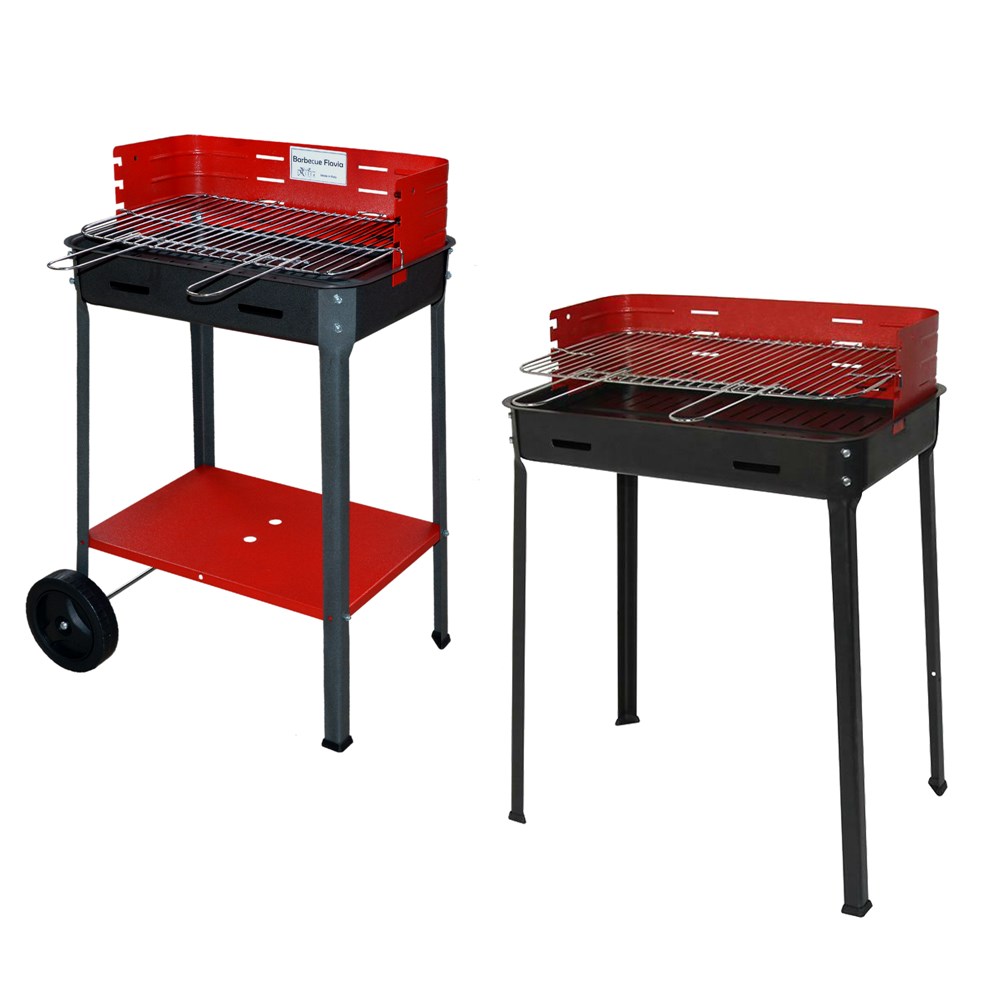Rectangular barbecue equipped with two gloves, wheels and trays at the end. There are certain places in 3 positions to be able to place the grill at different heights. Used with charcoal.