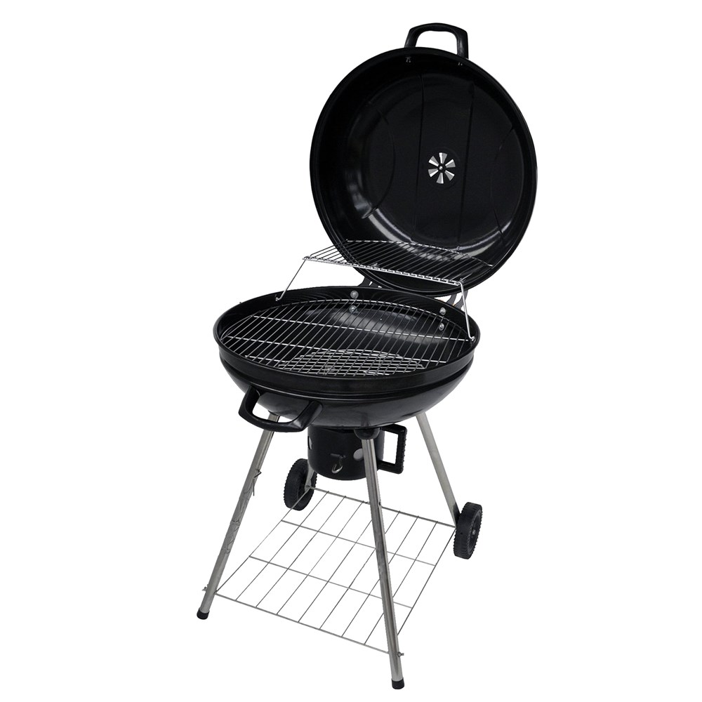 Round barbecue (grill) with 4 legs. Extremely practical and wheeled; easy to use. Equipped with lid (for maintaining heat), with ash holder with handle, with space for ventilation and with 2 wheels. This product is ideal for cooking and frying all kinds of traditional charcoal foods.