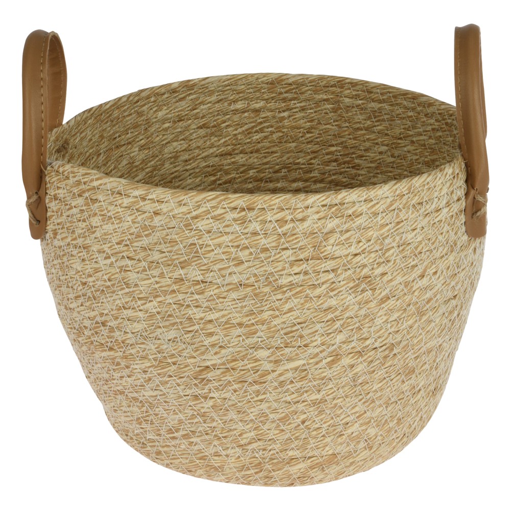 Storage basket with vegan leather handle. Perfect for storage while also being a nice decoration detail. Available in three different sizes. The basket is perfect for storage, and at the same time it works well as a nice decoration detail. Feel free to place it in the bathroom and store make-up or guest towels