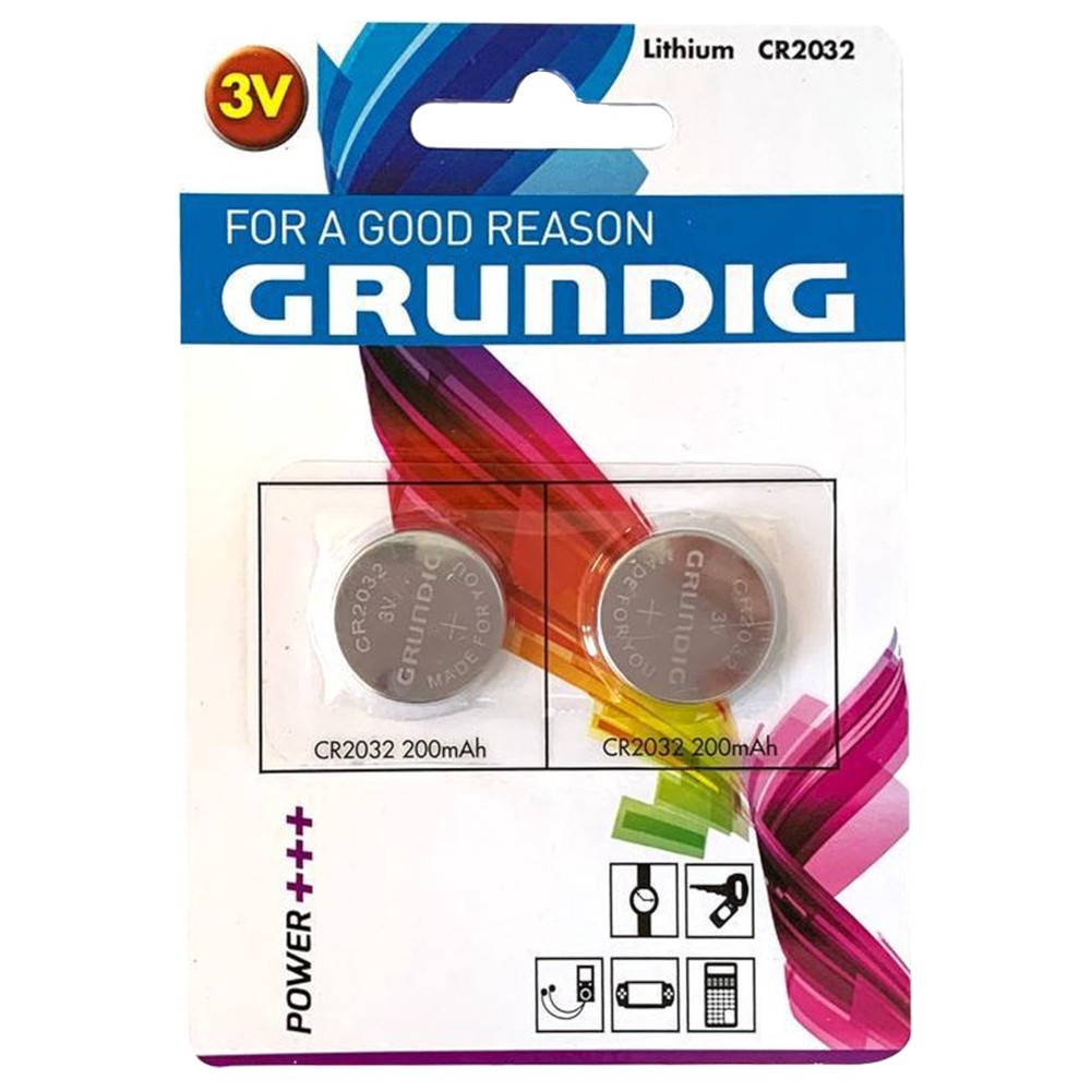 A CR2032 lithium button cell battery (non-rechargeable) from Grundig is often used in scales, smoke detectors, motherboards, glucose meters, heart rate monitors, "click on click off" and for car keys. CR2032 batteries have a diameter of 20mm and are 3.2mm thick. This set contains 2xCR2032 batteries.