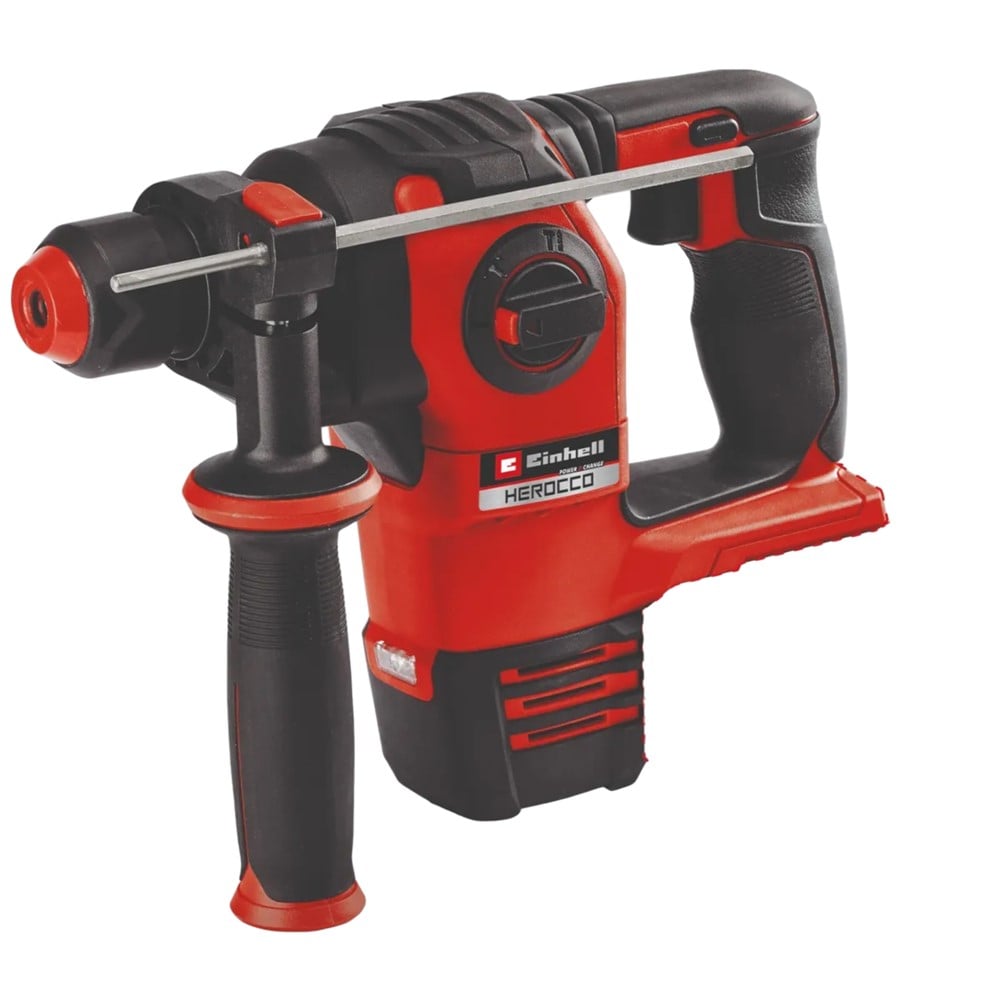 The Einhell Herocco 18/20 cordless hammer drill is a reliable performer when it comes to hammer drilling or chiseling with or without blockage. The device is powered by the Einhell PurePOWER brushless motor, which offers more power and a longer runtime than conventional motors. Designed as a member of the Power X-Change family, all rechargeable batteries in the system series can be used flexibly and without restrictions in the work and garden tool products from the system series. The pneumatic hammer mechanism, which has a frequency of up to 5,500 blows per minute, makes work easier and with an impact force of 2.2 joules, the hammer drill has a drilling capacity in concrete of up to 20 millimeters. The bits can be changed quickly thanks to the SDS-plus chuck that the hammer drill has. For comfortable operation, the grip part is ergonomically and softly designed. The LED light provides optimal illumination for the work area even in the darkest areas.