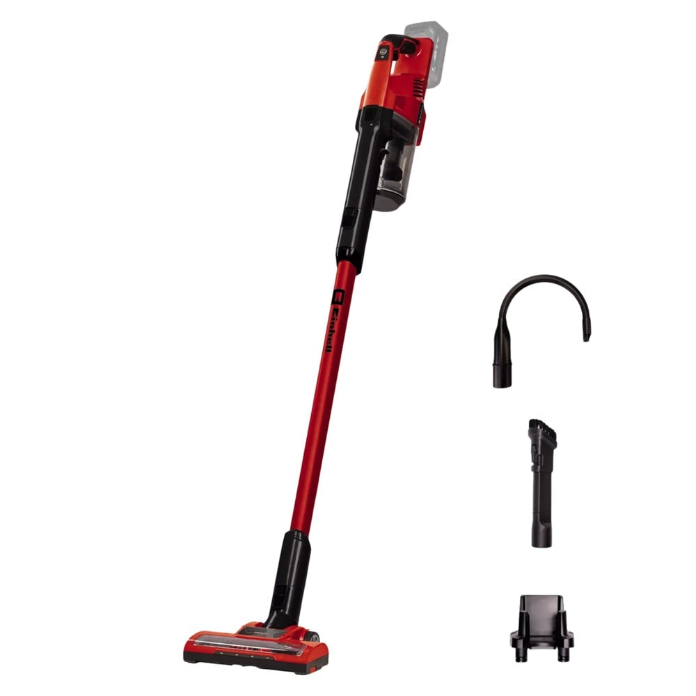 The Einhell cordless upright vacuum cleaner TE-SV 18 Li-Solo is part of the multifunctional and limitlessly combinable Einhell Power X-Change battery system. An 18 V battery is required to use the cordless upright vacuum cleaner. Uninterrupted work without a cable: This is made possible by the Power X-Change exchangeable battery system and fast charging technology. If the inserted battery is empty, it can easily be exchanged for a fully charged one. Depending on the battery, very long runtimes can also be achieved, as the 6 Ah battery, for example, provides the vacuum cleaner with up to 80 minutes of power in ECO mode. The four spotlight LEDs and a joint on the floor nozzle, which can be moved about two axes, enable easy cleaning, even of dark and hard-to-reach places such as under a bed or cupboard. The rubberised wheels are quiet and protect sensitive floor coverings such as parquet floors. Thanks to its compact and lightweight design, the cordless vacuum cleaner is easy to grip and fatigue-free, even when working for long periods of time. This makes vacuuming a real breeze. The efficient triple filter system consisting of a pre-filter, a replaceable and washable pleated filter and a motor filter and the integrated cyclone separator ensure clean exhaust air and efficient suction with high suction power. The dirt collection container is simply emptied at the push of a button, so an extra bag is not required. This protects the environment, saves money and is also very hygienic, as the user does not come into contact with the dirt. The vacuum cleaner can be adapted to any situation using two adjustable suction outputs. ECO mode can be used for normal dirt and for maximum runtime, while BOOST mode ensures maximum suction performance for stubborn dirt, such as on carpets. Thanks to the combination of two designs, the cordless vacuum cleaner is a practical 2-in-1 device. It can be used as a small and light hand-held vacuum cleaner, as well as for floor cleaning, where it impresses as an upright vacuum cleaner with perfect handling. The motorised floor nozzle is designed to remove dust and stubborn dirt from hard floors, carpets and rugs. The brush can also be easily detached and cleaned. A wall bracket is included in delivery, which provides space for storing the vacuum cleaner and accessories, so that everything is neatly stored, but always within reach. The supplied flexible crevice nozzle is ideally suited for vacuuming in hard-to-reach places, for example between the seats in the car. A single press of the on switch is sufficient for the vacuum cleaner to run continuously. The power button does not need to be pressed down permanently. Delivery of the cordless upright vacuum cleaner does not include a battery or charger, but these are available separately.