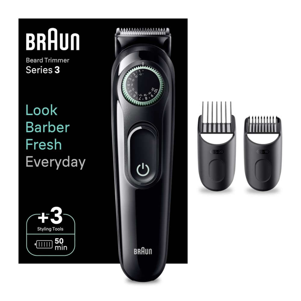 Precise styling at home: ease, precision and 100% control with the Braun 3 beard trimmer. Great results with every stroke: the reliable blade will evenly cut any beard. 100% control at your fingertips: choose from 40 setting length settings in precise 0.5mm increments with a fine adjustment wheel. Trim long and short hair freely at home: Styling tools help you achieve clean lines, even cuts and perfect styling details for great results. Built to last: This men's trimmer has a washable head and combs for easy cleaning. It is equipped with a powerful nickel-metal hydride battery that provides 50 minutes of cordless operation and reliable blades.