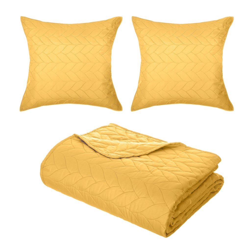 Double bedspread set, in yellow color, which includes a bedspread and two pillowcases. The bed cover has polyester filling, which gives it hypoallergenic properties, that help in maintaining the freshness and clean feeling for a longer time. The monochrome design with stitched texture of the bedspread makes this set an original choice for your bedrooms, which can go well with other decorative objects in your interiors. The set can be washed easily in a washing machine and is resistant to stains.