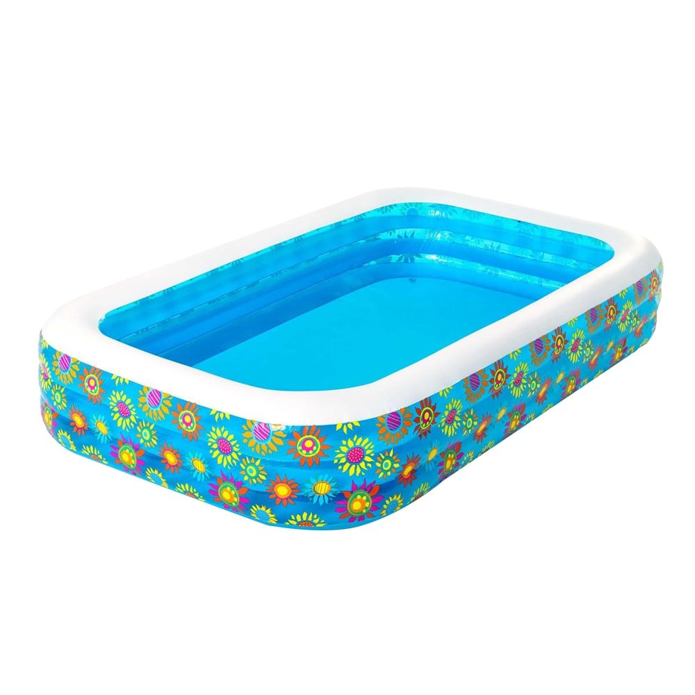Inflatable above-ground paddling pool for children, in a rectangular shape, made of sturdy and pre-tested polyvinyl chloride (PVC) material, with a thickness of 0.32 cm, which makes it more durable to sunlight and cold weather and makes it puncture-resistant. The support structure of the pool is made of wide sidewalls with colorful flower-themed graphic prints, composed of 3 equal inflatable rings, that allow for children's safety during play. Each of the inflatable rings is equipped with a valve, which allows to inflate the pool, while allowing to select the proper height and depth for the pool (for younger kids it would be suitable to inflate only 2 rings, so that the pool is not too deep). The pool can be easily cleaned and drained using a drain valve located on the inner base of the pool. The pool has dimensions of 305x183x56 cm and a water capacity of 1161 liters. It can be assembled and dismantled easily in only 30 minutes, using an air pump. The set also contains self-adhesive repair-patching pieces, made of polyvinyl chloride (PVC) material, which can be used to efficiently repair the small damages of the structure. This product is suitable to use by children over 6 years old.