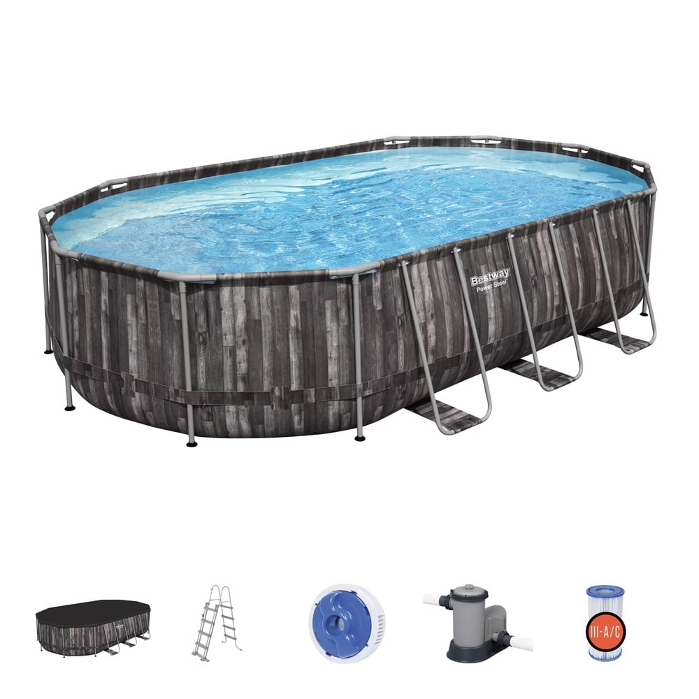Removable above-ground Power Steel™ pool, in an oval shape, with wood decor prints, made of synthetic Tritech™ material, composed by a triplate polyvinyl chloride (PVC) layer, covered with 2 layers of vinyl PVC at the ends and reinforced with a layer of polypropylene industrially welded on the inside, which makes it more durable and puncture-resistant. The tubular support structure is equipped with a Seal & Lock™ assembling system, for a solid and secure pipe connection, with a constituent material made of galvanized steel, which has anti-rust properties and it is resistant against the corrosion caused as a result of the chemical and electro-chemical agents' action on the metallic surface. The pool has dimensions of 590/610x344/431x122 cm, a water capacity of 20241 liters, and support structure dimensions of 590/610x366/431x122 cm. It can be assembled and dismantled easily in only 20 minutes. The set also contains: