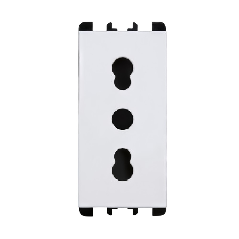 Bivalent socket, 2-pole with earthing (2P+T), 16A, white color, Simon Urmet brand. Designed to accept both standard Italian plugs (10/16A) and Schuko plugs, offering maximum flexibility in use. Ideal for mixed residential or professional environments. Elegant design and high quality.