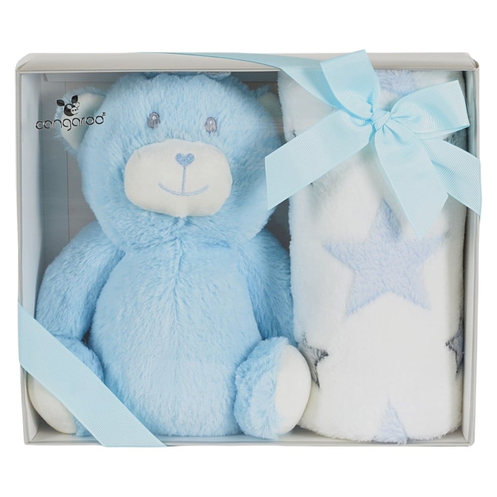 Sweet and cozy set for children, includes a soft blanket and a teddy bear. The blanket measures 90x75 cm and is ideal for keeping children warm while sleeping. With a pleasant blue color and adorable teddy bear design, this set is perfect for gifts for babies and toddlers.