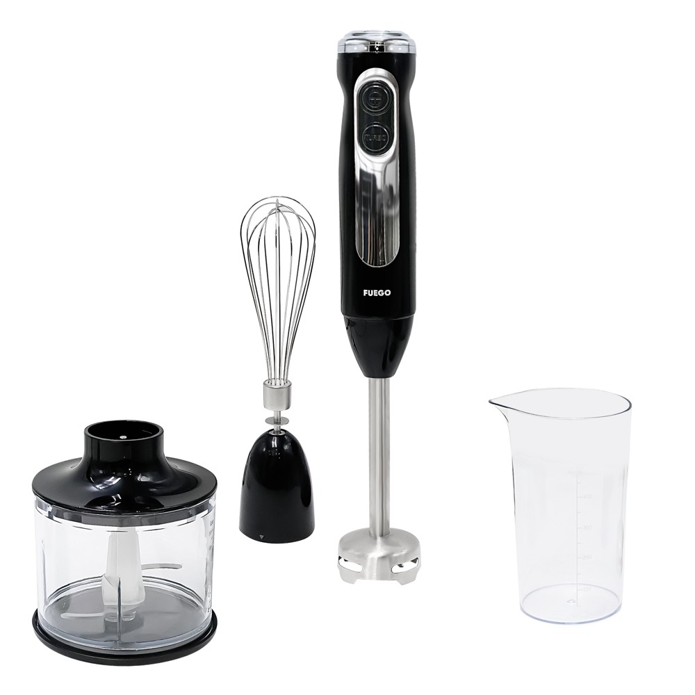 800 Watt hand blender. 3 in 1 set for pureeing hot soups, chopping onions and whipping cream and egg whites. 2 speed levels. 600 ml container and 2 sharp stainless steel blades. Including measuring cup with scale, 50ml, 100ml, —, 700ml. Ideal for pancakes, waffle batter, sauces, egg whites and cream.