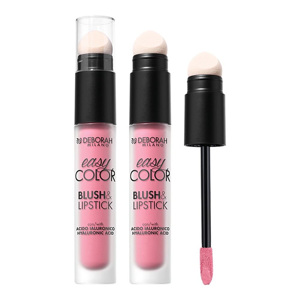 Easy Color Blush&Lipstick, a two-in-one combo that can be used on the lips and cheeks. Formulated with Hyaluronic Acid and organic Sweet Almond Oil for smooth and effortless application. The velvety texture delivers a hint of blendable, buildable, long-wearing colour that artfully enhances lips and cheeks. The innovative dual-purpose applicator has a sponge tip on one end for blending the product over lips and cheeks, and a flocked tip on the other for precisely contouring the lips. Dermatologist tested.