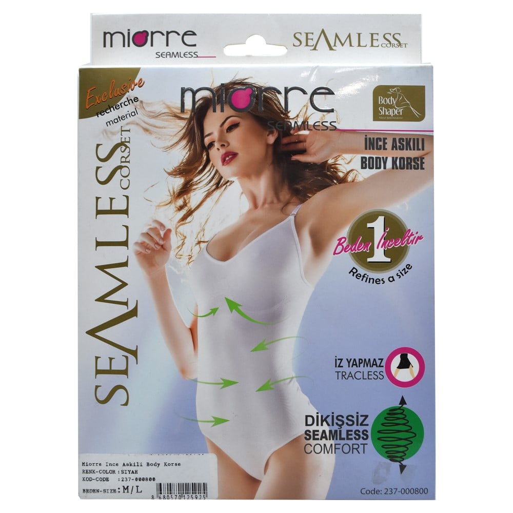 Body corset for women, with a uniform and seamless design, which makes the corset invisible even under tight clothes. The corset has a strong tightening effect on the sides, under the chest area and in the buttocks area. The constituent material is lightweight and soft to the touch and does not irritate the skin.