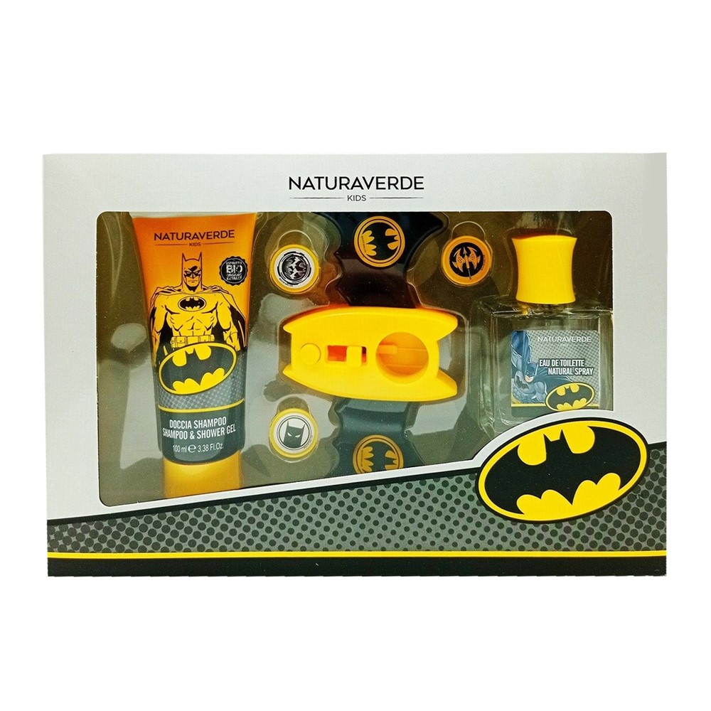 Kids' body care set, which contains a body shampoo, a bottle of natural scented perfume and a Batman Disc Shooter toy. The shampoo has a dermatologically tested composition, is gentle on the skin and has moisturizing and nourishing effect. This set can be used as a gift for children.