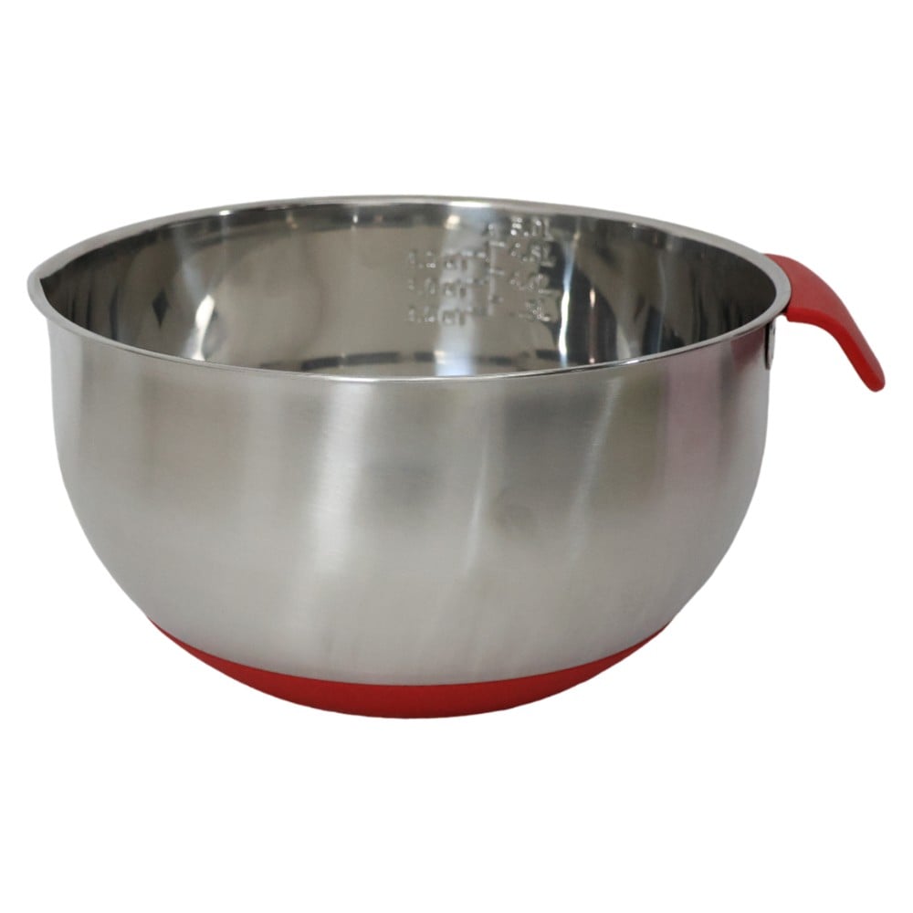 Elegant bowl made of stainless steel in silver color, with a diameter of 25 cm and a height of 13 cm. Suitable for mixing and mixing while cooking. Thanks to the silicone bottom layer, the bowl does not slide on the counter or the kitchen table.