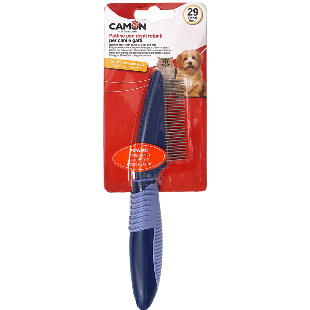 Combs handy and easy to use. The teeth are made of steel and rotate on themselves to increase combing efficiency and not irritate the animal's skin. They feature an ergonomic rubber and plastic handle for safe control of the tool. Comfortable for the dog owner, excellent for the professional groomer. They remove parasites and dirt easily, quickly and effectively.