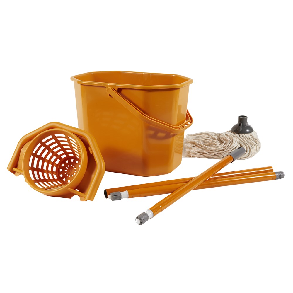 Bucket set with squeeze device, squeegee and stick divided into 3 parts 130 cm. Using our set is very simple. You can dip the mop into the bucket without bending over and getting your hands dirty. The squeezer allows you to dry it without using too much pressure, thanks to the ease of practicality. Cleans thoroughly and reaches even the most difficult spots.