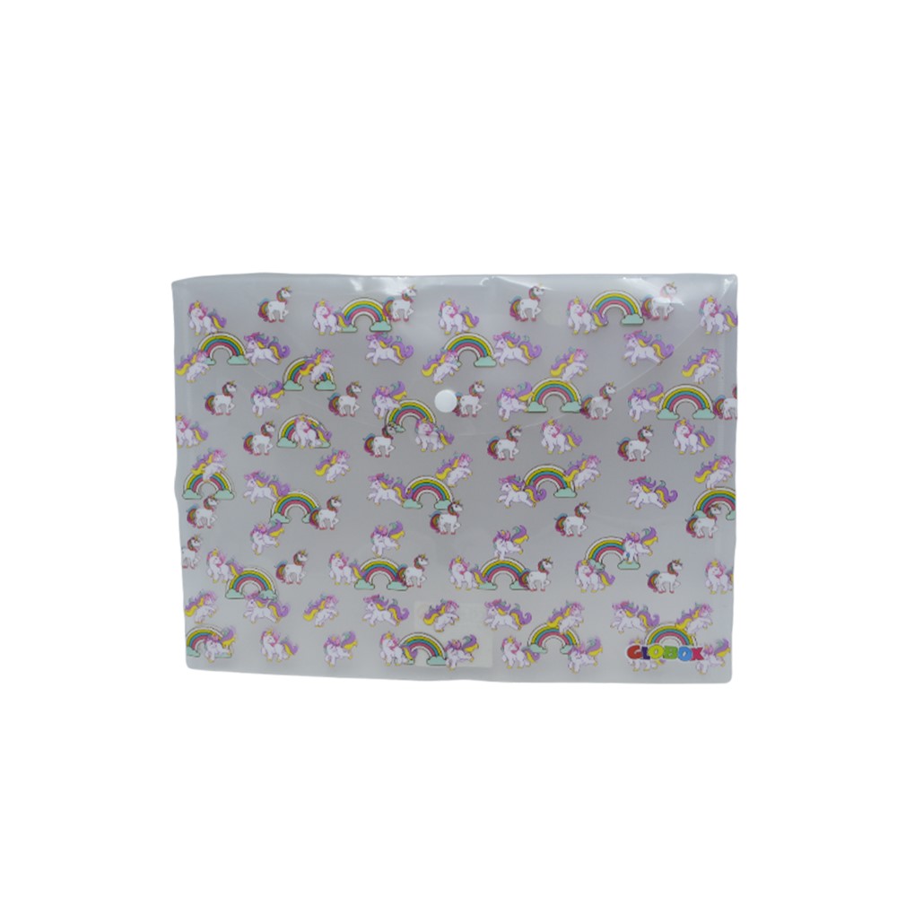 Button file folder, made of durable plastic material, with dimensions of 21x29.7 cm for A4 format paper sheets, in transparent color. It is used by pupils and students to place and store various documents, daily task papers or creative works, as well as to easily transport them without damaging the sheets. This product is practical and suitable for daily use.