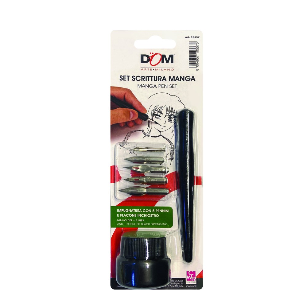 Writing set composed of a handle, five nibs and a bottle of black India ink. A well-organized starter kit for learning or perfecting manual calligraphic writing and for making Manga sketches and drawings.