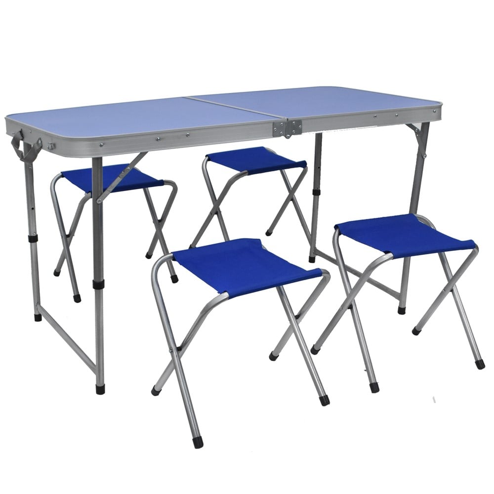 Camping set, which features a portable camping table and 4 folding camping benches. The table is made of 4 mm MDF material, with a supporting structure made of iron and aluminum, with dimensions of 60x120 cm. The set can be used on camping trips, picnics or on the beach and can be easily transported thanks to its compact dimensions.