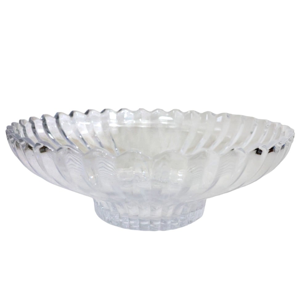 Bonbon or fruit of transparent glass with diameter 31 cm and height 10.5 cm. This product is an elegant addition to the décor of your home or to serve fruits and cakes.