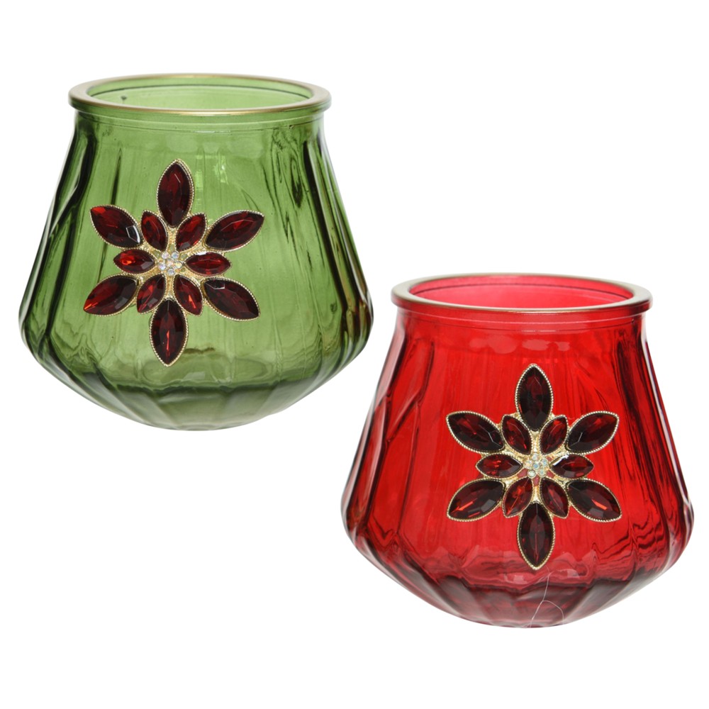 These glass candle holders come in festive green and red tones, featuring an elegant central floral design that adds a warm, decorative touch. Measuring Dia.11xH10.5 cm, they are perfect for creating a cozy ambiance during evenings or celebrations. The colored glass diffuses light beautifully, making them ideal for use on tables, shelves, or as part of a seasonal décor arrangement.
