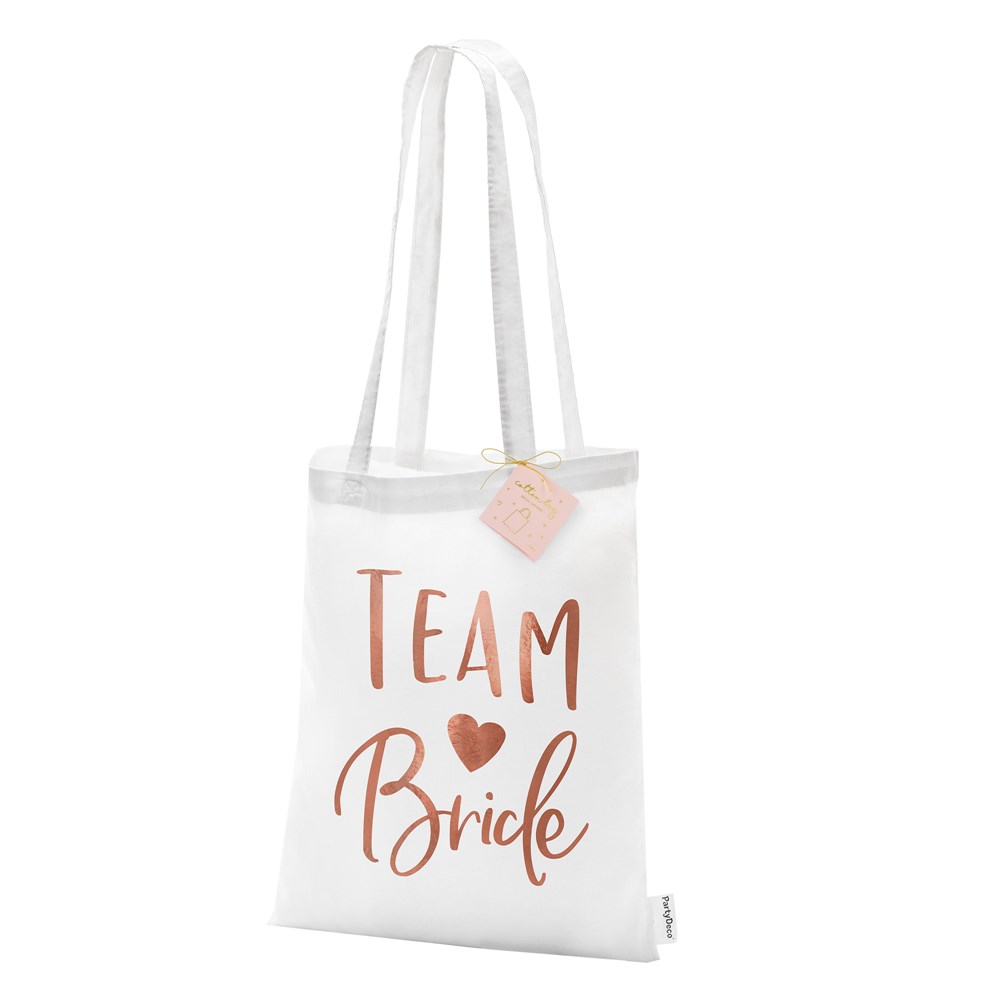 Barchelette party bag, made of white cotton with Team Bride inscription in golden rose writing color. Approximate size 39 x 42 cm.