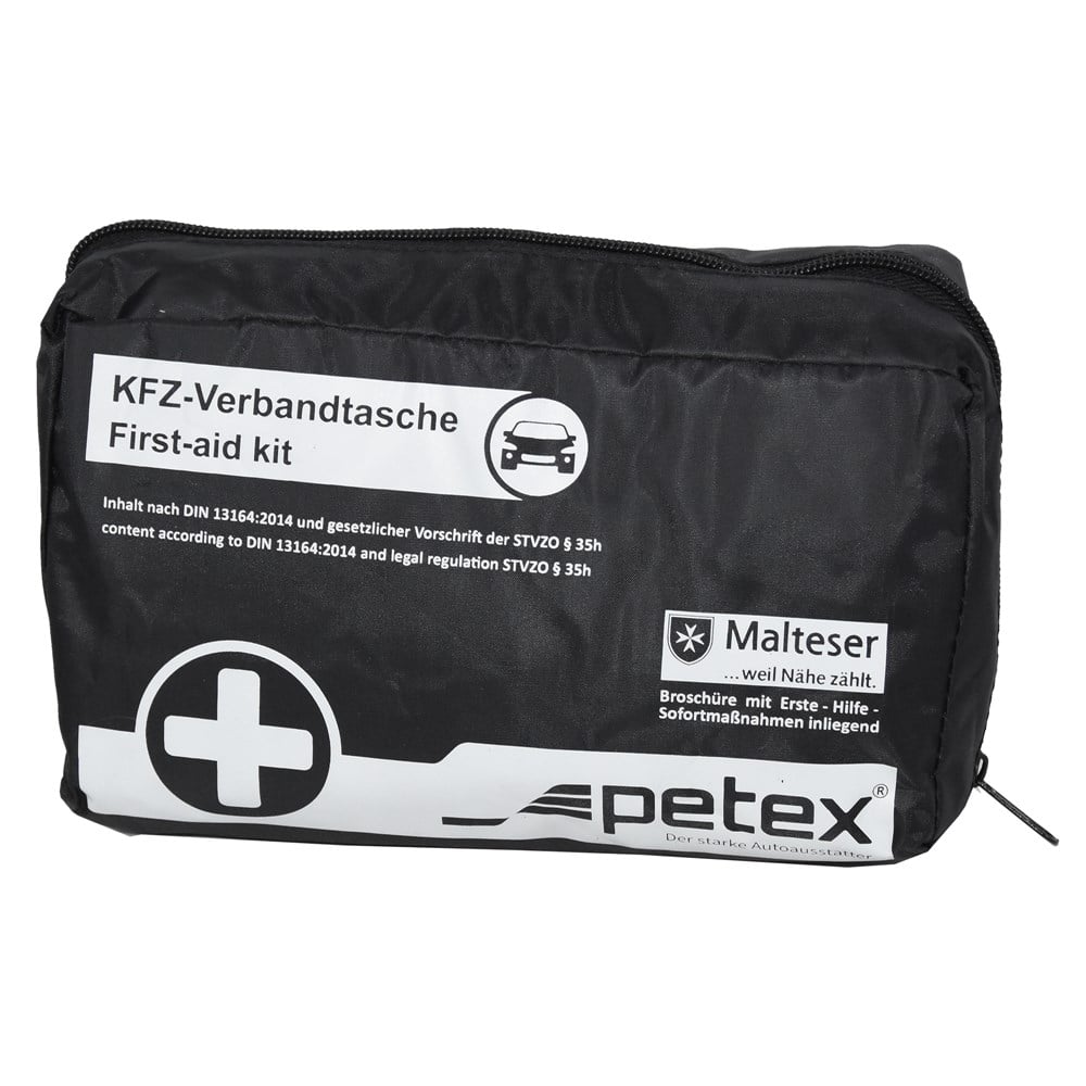 Car First Aid Kit. The small, handy car first-aid bag made from water resistant nylon with zipper correspond to the DIN 13164. According to DIN 13164. Fits in the holder in Audi and VW vehicles. 1x adhesive plaster DIN13019A 5 m x 2.5 cm, 8 x wound quick association DIN13019E 10 cm x 6 cm, 3 x compression bandages DIN 13151-M, 1 x compression bandages DIN 13151-G, 2 x association cloth DIN 13152-BR, 1 x DIN 13152-A bandage cloth, 6 x compress - 100 mm x 100 mm, 1 x rescue blanket - 2.1 m x 1.6 m, 2 x DIN 61634-FB 6 elastic bandage, 3 x DIN 61634-FB 8 elastic bandage, 1 x Triangle bandage DIN 13168-D, 1 x DIN 58279-B190 shears, 4 x glove according to DIN EN 455, 1 x First Aid Brochure - Instructions for first aid in the event of accidents, 1x table of contents. 2 x wet wipes for cleaning of skin.