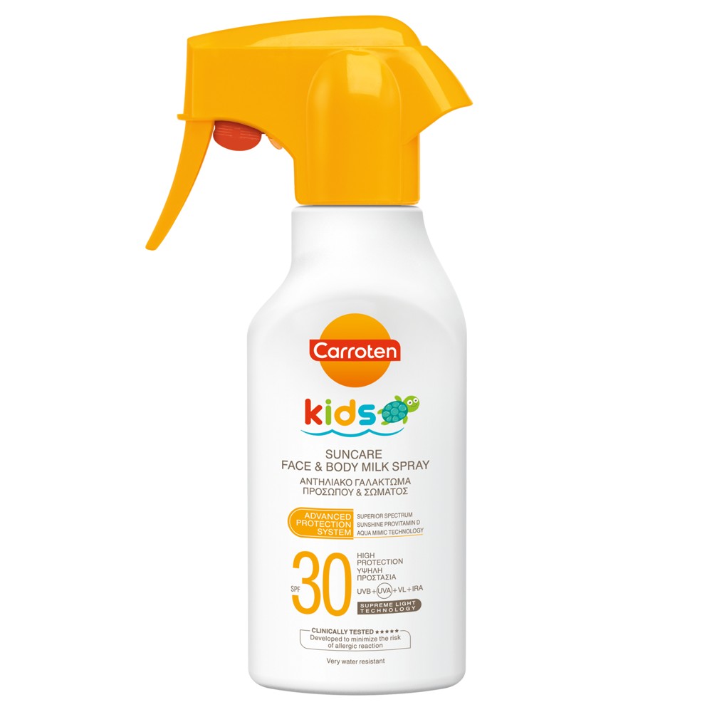 Carroten Kids Face and Body Sunscreen SPF30, 270 ml, in the form of a spray, offers easy application and added protection for the skin, targeting the widest range of all the sun's rays. Enriched with Beta-Glucan, it stimulates the defense of the immune system of sensitive children's skin, effectively protecting it from aggressive external factors that cause irritation and Provitamin D to strengthen its protection against UV radiation, with protective protection 4-fold improved UVB+UVA+VL*+IRA