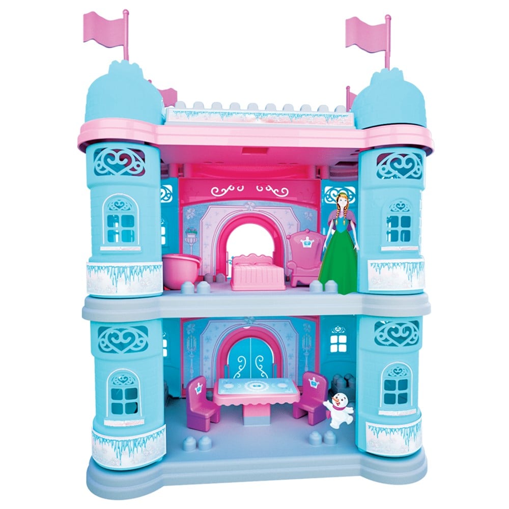 Castle toy set for children, with two stories, which contains 4 flags, 4 castle towers, a table, 2 chairs, a bed, a bathtub and other accessories, made of plastic material, in pink and blue color. This toy helps develop motor skills, learning skills and thinking skills, and stimulates the development of imagination in children. The constituent material and the paint have no toxic or harmful composition for children and the product is certified for children's safety. This product is suitable for use by children over 3 years old.