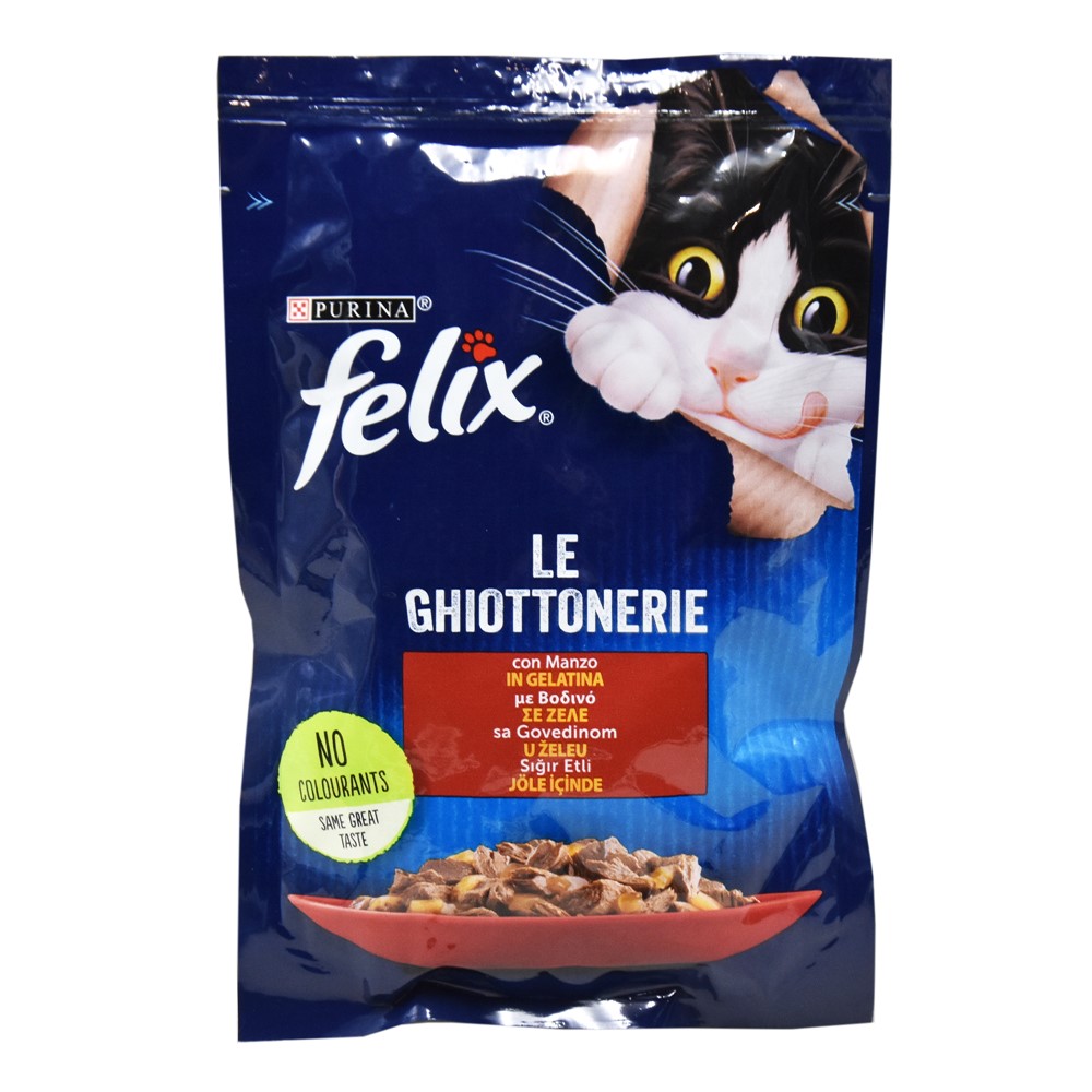 "Complete food for adult cats FELIX Le GHIOTTONERIE is a series of irresistible recipes with a look, aroma and taste so delicious that you will feel like you have cooked them with your own hands. Each recipe is prepared with soft bites in a delicious jelly to offer your cat an irresistible meal! They are also a source of Omega 6 essential fatty acids and contain the right combination of balanced minerals and vitamins that help your cat stay full of vitality and always ready for new jokes! They are healthy and meet 100% of your cat's daily needs, if administered according to the instructions for use and the daily ration shown on the packaging. And that's not all! FELIX Le GHIOTTONERIE is available in a wide variety of delicious recipes in delicious jellies to satisfy your cat's desire for variety every day. They are simply delicious! - 100% complete and balanced - Balanced minerals - Vitamin D&E - Source of Omega 6 fatty acids - No artificial flavors added; - No added artificial preservatives; - Without adding artificial colors Meat and derivatives (of which beef 4%), Vegetable protein extracts, Fish and fish by-products, Minerals, Sugars. Humidity 80% Protein 13.0% Crude oils and fats 3.0% Crude ash 2.2% Raw fiber 0.5% Linoleic acid (omega 6 FA): 0.2% Humidity 80% Protein 13.0% Crude oils and fats 3.0% Crude ash 2.2% Raw fiber 0.5% Linoleic acid (omega 6 FA): 0.2% "