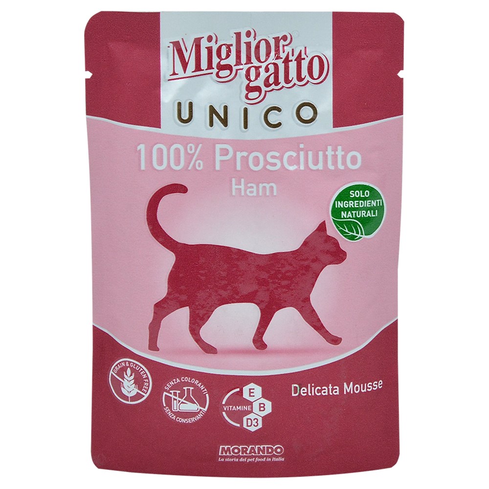 Migliorgatto Unico is a complete food suitable for daily nutrition of all cats, obtained from natural ingredients. Its main characteristics should be 100% of a single protein source and be free from cereals. This recipe makes it the ideal product for those who want to preserve their cat from the effects of any food intolerance in meat that is unlike ham. Hypoglycoside is unique to the type of protein used, unique to its flavor, unique to its freshness and nutrition that it guarantees.