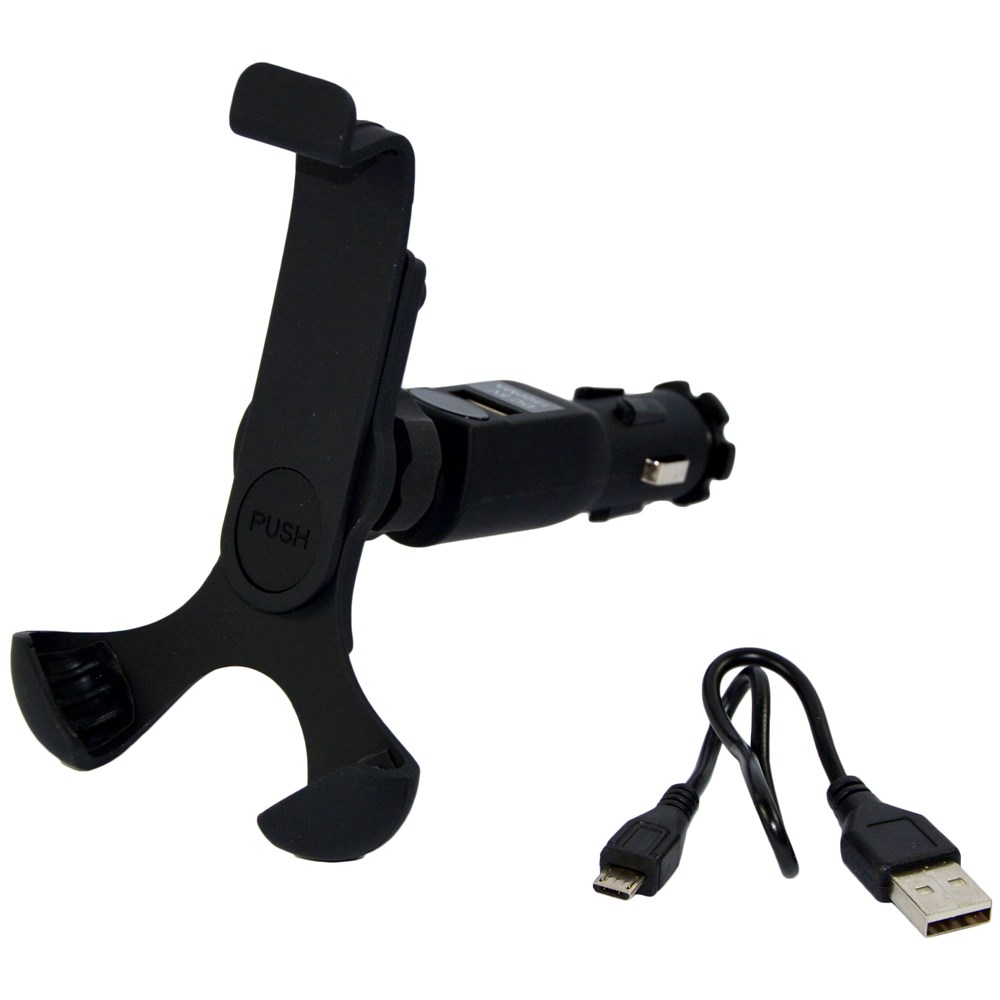 Universal Car Holder & Charger is perfect solution for active people. Allows to frequently replace mobile devices with one hand only. This universal holder is perfect for smartphones and GPS devices Red, rubber buckle perfectly and firmly holds the device while driving."3. Cabel with three tips - MiniUSB, MicroUSB and iPhone/iPod/iPad.
