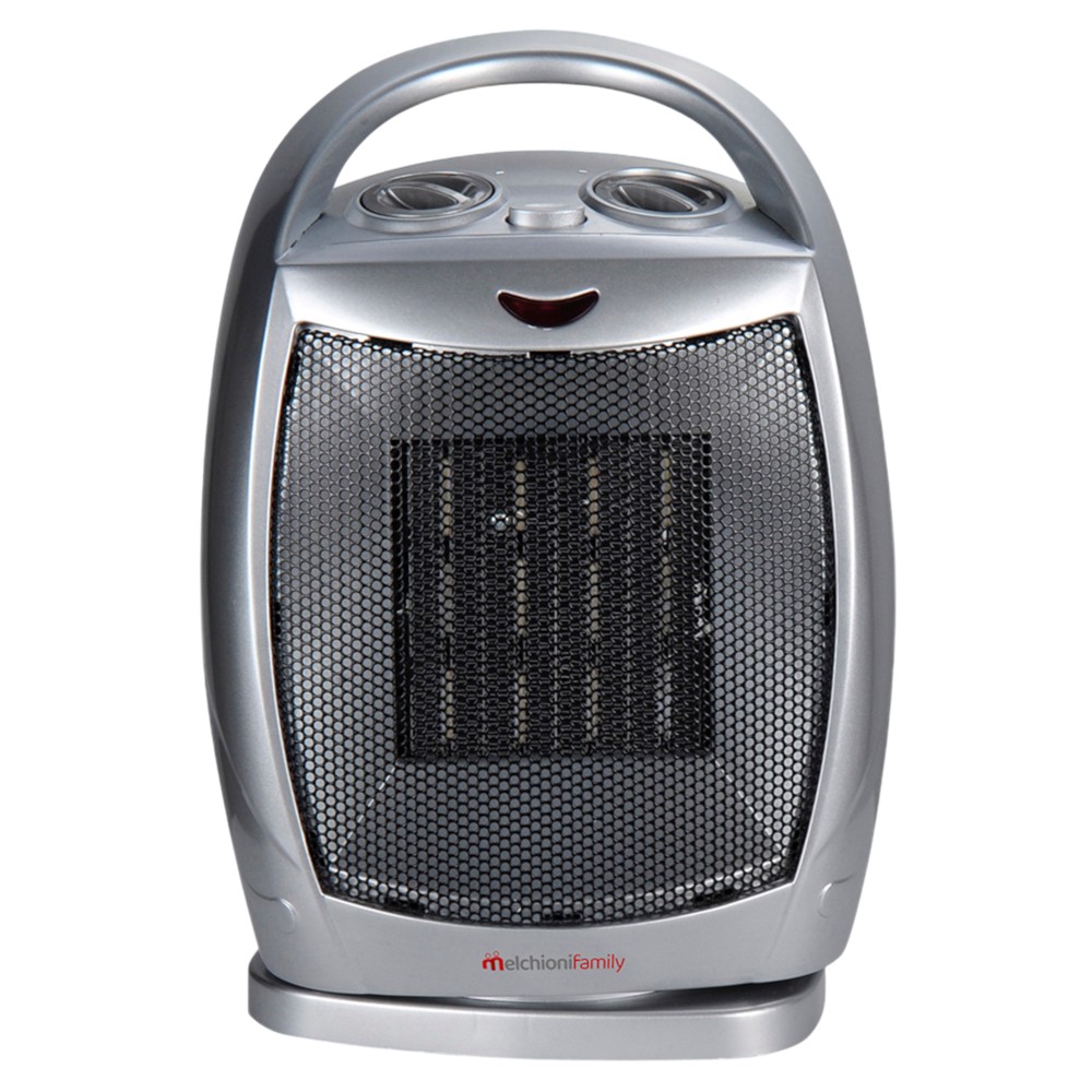 Ceramic fan heater Melchioni 1500W with oscillation and comfortable handle. Ceramic heating elements, oscillation. Integrated thermostat, 2 selectable power levels (750/1500W. LED operating indicator. Protection against overheating.