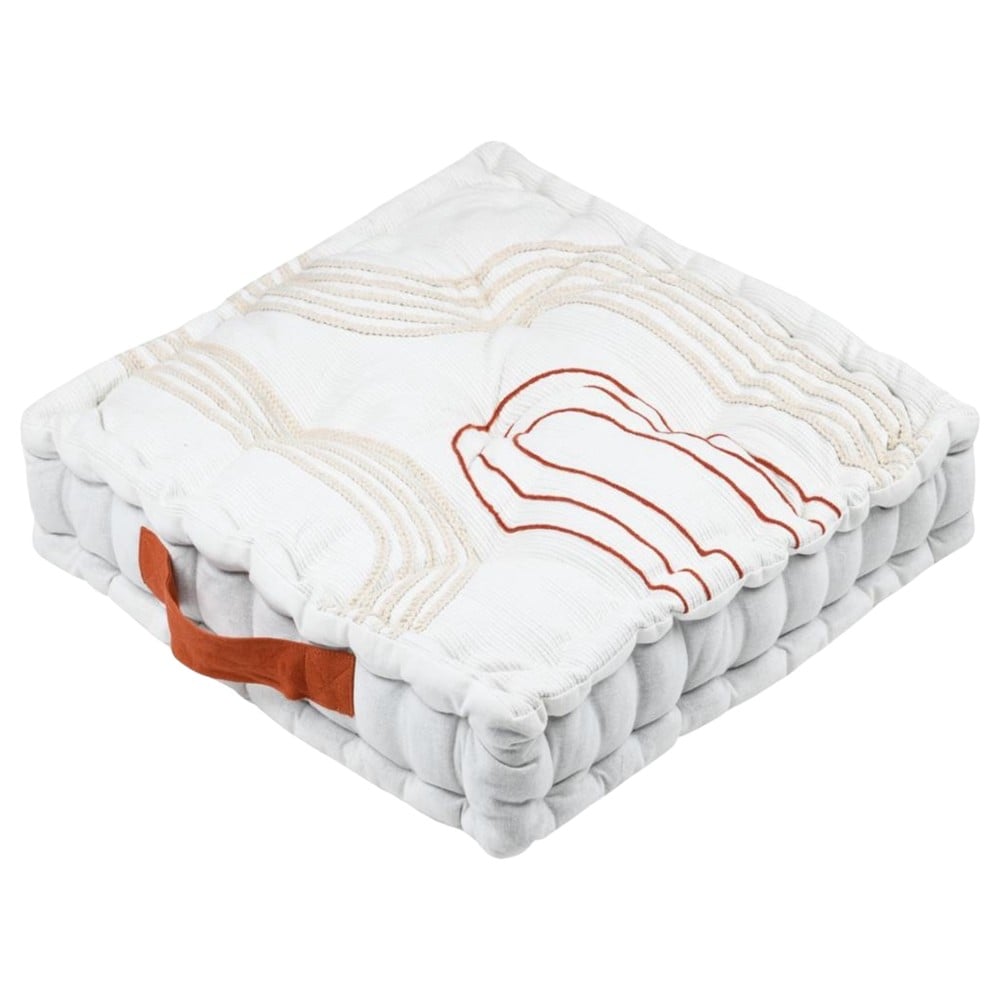 White floor tiles and red matte details. The outer fabric is made of 80% cotton and 20% jute, while the inner filling is made of polyester. There is no chain. It has a handle on the side for easy transport. Give your space a feeling of relaxation and comfort, with high possibilities of combinations with light colored decorative elements.